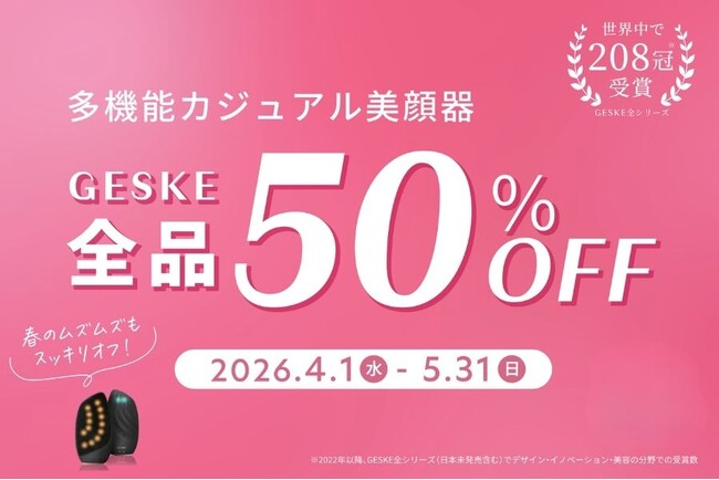 株式会社ドリームファクトリー(本社:大阪市 代表取締役社長:鳥井若太郎)にて、国内販売を行っているドイツ発のカジュアル美顔器【GESKE(ゲスケ)】より、季節の変わり目のこの時期の“ゆらぎ肌”をサポートする“全17品・50%OFF”の母の日限定キャンペーンを2026年4月1日(水)~2026年5月31日(日)まで実施いたします。(ECは 6/1 AM10:00まで)