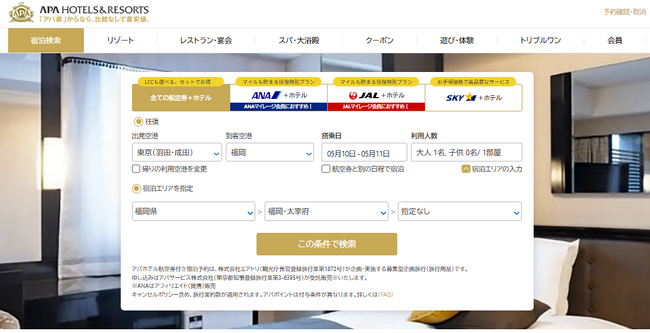 アパホテル公式サイトの航空券付き宿泊予約がリニューアル!