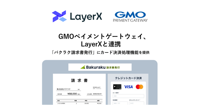 GMOインターネットグループのGMOペイメントゲートウェイ株式会社(代表取締役社長:相浦 一成 以下、GMO-PG)は、株式会社LayerX(代表取締役CEO:福島 良典 以下、LayerX)が提供する、AI請求書送付システム「バクラク請求書発行」に対し、カード決済処理機能を提供します。これにより、「バクラク請求書発行」において、請求書のクレジットカード払いを可能にする「カード決済オプション」の提供を支援します。本オプションは、2026年4月1日(水)より提供されます。