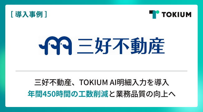 経理AIエージェントを提供する株式会社TOKIUM(本社:東京都中央区、代表取締役:黒崎 賢一、以下「TOKIUM」)は、株式会社三好不動産(本社:福岡市中央区、代表取締役社長:三好修、以下「三好不動産」)がTOKIUM AI明細入力を導入したことをお知らせします。三好不動産はすでに活用中のTOKIUMインボイスと連携し、請求書の受領から仕訳入力までを一気通貫でAI化することで、年間450時間の工数削減と業務品質の安定化を目指します。
