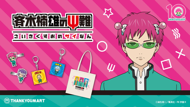 「Be Smile, Be Kawaii」をテーマに、キャラクターの限定アイテムを中心としたカワイイ推しグッズがいつ来てもALL390円で手に入るショップ「サンキューマート」(エルソニック株式会社)は、アニメ「斉木楠雄のΨ難」のオリジナル雑貨を、全国のサンキューマート店舗で5月下旬より入荷次第販売開始いたします。