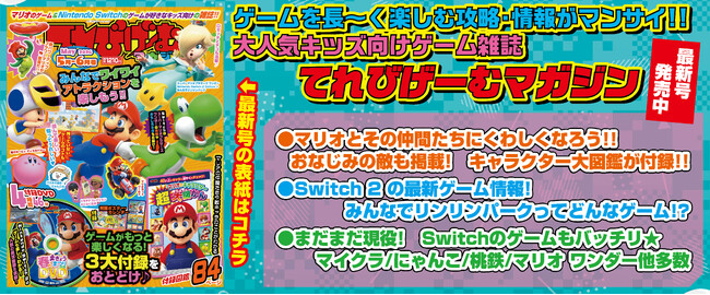 [画像9: https://prcdn.freetls.fastly.net/release_image/7006/19096/7006-19096-09aa19d2b645c2b9765167fc77ef342f-350x150.jpg?width=536&quality=85%2C75&format=jpeg&auto=webp&fit=bounds&bg-color=fff ]『てれびげーむマガジン』は2026年に創刊18年を迎えるゲーム雑誌です。4歳~10歳くらいのお子様を対象としており、キャラクターのイラストやゲームの画面写真など、ビジュアルを中心にしたにぎやかな誌面が特徴。使っている漢字は小学3年生で習うものまでで、すべての漢字に読み仮名がふってあるので、文章を読む練習にもなります。