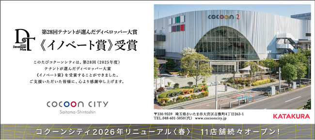 カタクラが運営するJRさいたま新都心駅前社有地商業エリア「コクーンシティ」におきまして、繊研新聞社主催「第28回(2025年度)テナントが選んだディベロッパー大賞」の「イノベート賞」を受賞しましたので、お知らせします。