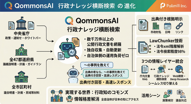 行政AXのトップランナーであるPolimill株式会社(本社:東京都港区、代表取締役:伊藤あやめ/谷口野乃花)は、行政向け生成AI「QommonsAI(コモンズAI)」の中核機能である「行政ナレッジ横断検索」において、収録対象を全47都道府県・全市区町村・全中央省庁の公開行政文書に拡大したことをお知らせいたします。