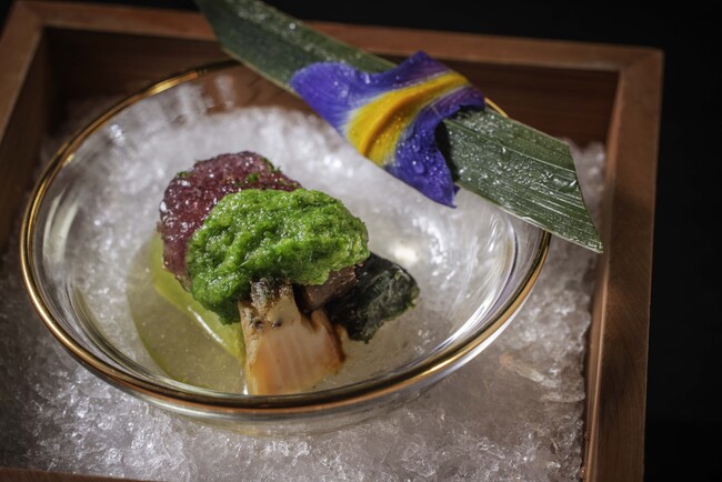 初夏に旬を迎える鮑や白ずいき、オクラを使った先附です。日本酒と昆布で酒蒸しにした鮑は、ほのかな磯の香りとふっくらとした柔らかさを備え、白ずいきの瑞々しいシャキシャキとした食感と重なります。金時草の紫色を移した彩り寒天に、すり下ろした翡翠色のオクラを添え、雨に濡れる紫陽花を表現しました。素材本来の旨味に、金時草やオクラの爽やかな香りが広がる涼やかな一皿です。