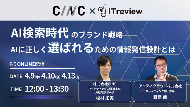 株式会社CINC(本社:東京都港区、代表取締役社長:石松友典、以下CINC)は、2026年4月9日(木)にオンラインセミナー『AI検索時代のブランド戦略 - AIに“正しく選ばれる”ための情報発信設計とは -』を開催いたします。