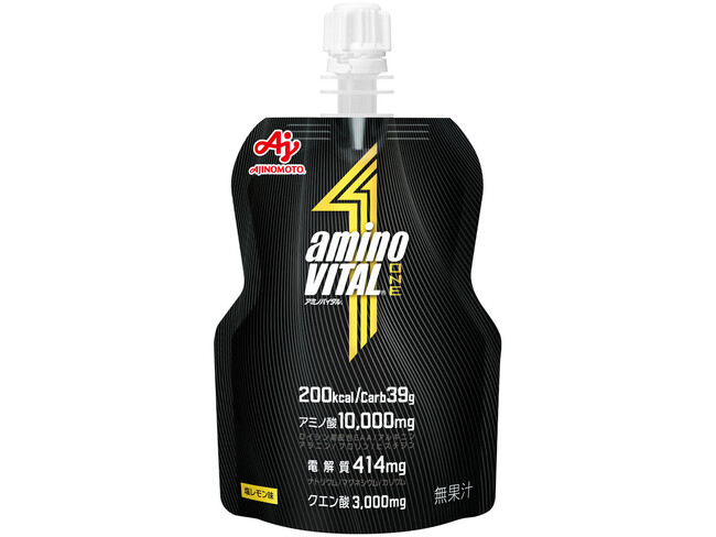 ハードな持久系競技で大切な糖質、ロイシン高配合EAA、電解質、クエン酸と必要なものを1本に。「アミノバイタル(R)」ブランド史上最大量のアミノ酸10,000mgを配合した“オールインワンゼリー”です。キャップ付きのパッケージなので、長時間に渡るレースの好きな時に好きな量を飲むことができます。甘さ控えめの塩レモン味で、特にスポーツの前や中盤におすすめです。