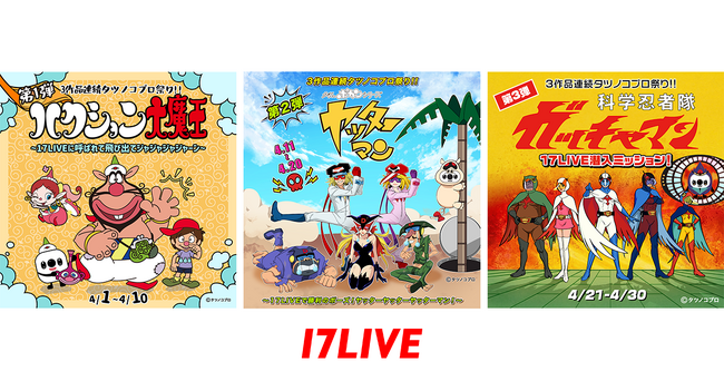 17LIVE株式会社(東京都渋谷区、代表取締役:ジャン・ホンフイ、URL:https://jp.17.live/)が運営する日本最大級のライブ配信アプリ「17LIVE(イチナナ)」は、長きにわたり愛される名作アニメーションを輩出する株式会社タツノコプロ(東京都武蔵野市、代表取締役社長 十川淳)が制作した国民的アニメ、「ハクション大魔王」「タイムボカンシリーズ ヤッターマン」「科学忍者隊ガッチャマン」と連続でコラボレーションするアプリ内イベント、「3作品連続タツノコプロ祭り!!」を2026年4月1日(水)から4月30日(木)まで開催することが決定しましたので、お知らせいたします。