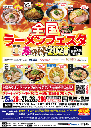 ヤマダホールディングスグループの株式会社ヤマダデンキ(本社:群馬県高崎市、代表取締役社長:佐野 財丈)は、2026年4月25日(土)より開催される「全国ラーメンフェスタ 春の陣2026 IN 前橋吉岡」の運営に協力いたします。