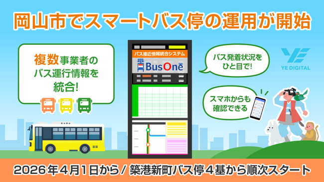 株式会社YE DIGITAL(本社:福岡県北九州市、代表取締役社長:玉井裕治、以下 YEデジタル)は、岡山市内の岡南方面の乗り継ぎ空間整備事業において、当社の「スマートバス停」が採用され、2026年4月1日より築港新町バス停に設置された4基から、順次運用が開始されることをお知らせいたします。