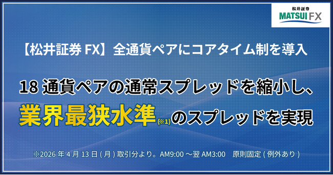 松井証券株式会社(本社:東京都千代田区、代表取締役 社長執行役員:和里田 聰、以下「当社」)は、2026年4月13日(月)取引分より、外国為替証拠金取引(FX)において、米ドル/円のみとしていたコアタイム制の対象を、全通貨ペアに拡大いたします。加えて、ユーロ/円等の18通貨ペアの通常スプレッドを縮小し、業界最狭水準(※1)の通常スプレッドを提供することをお知らせします。