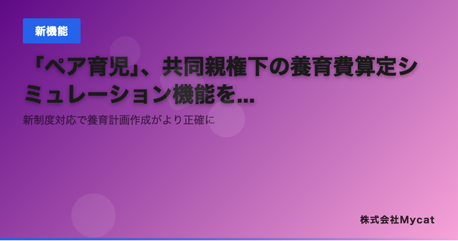 株式会社Mycat(本社:東京都目黒区)は、AI共同親権支援プラットフォーム「ペア育児」(https://pear-ikuji.com)において、2026年4月施行の共同親権制度に対応した養育費算定シミュレーション機能を追加したことをお知らせいたします。