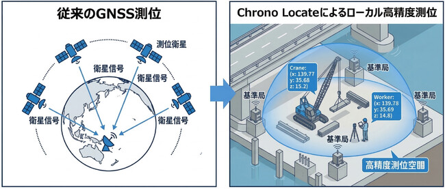 GNSSが衛星からの一方向通信によって位置を算出するのに対し、Chrono Locate(TM)は地上に配置した基準局と高精度時刻同期技術を組み合わせることで測位を行う、衛星に依存しない新しい位置情報基盤です。