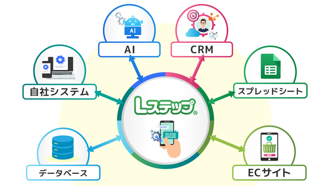 LステップのAPI連携機能は、自社システムやECサイト、CRM、AIといった外部システムとLステップを直接連携し、友だちリストの取得・タグの更新、トーク履歴の取得などの操作をプログラムから実行できるものとなります。