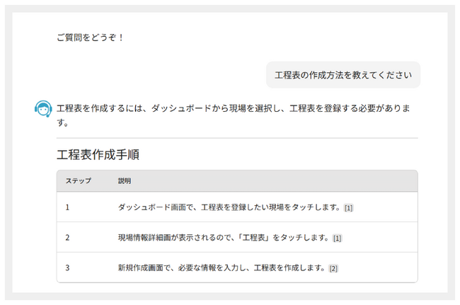 現場Plusの画面から直接AIに質問し、その場で回答を確認できます。問い合わせや確認にかかる手間が削減されることで、施工管理の判断と次の行動をスムーズに進められるようにします。