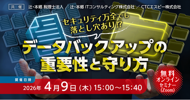 辻・本郷 税理士法人(本社:東京都新宿区、理事長:桑木小恵子)は、辻・本郷 ITコンサルティング株式会社(本社:東京都渋谷区、代表取締役社長:黒仁田健)、CTCエスピー株式会社(本社:東京都港区、代表取締役社長:上克也)と共催で、2026年4月9日(木)に無料オンラインセミナー「セキュリティ万全でも落とし穴あり!? データバックアップの重要性と守り方」を開催いたします。
