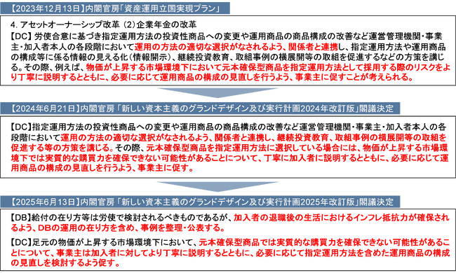 - また、DBについては、将来の給付水準が相対的に低下しないよう、加入者の退職後の生活におけるインフレ抵抗力が確保されるような給付改善等の検討が求められます