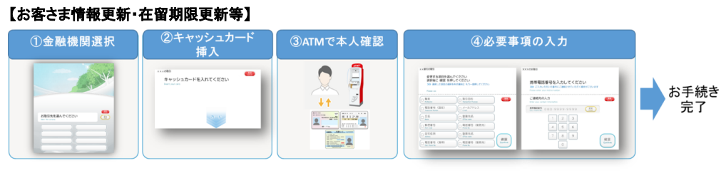 大分銀行では、「ATMお知らせ」を継続的顧客管理における情報確認やローン告知等に、「ATM窓口」サービスを住所・電話番号等の各種お客さま情報の変更および外国籍のお客さまの在留期限の更新にご活用いただきます。両サービスの導入により、「ATMお知らせ」でお客さま情報の確認を行い、変更が必要な場合にはそのまま「ATM窓口」にてワンストップでのお手続きが可能になります。
