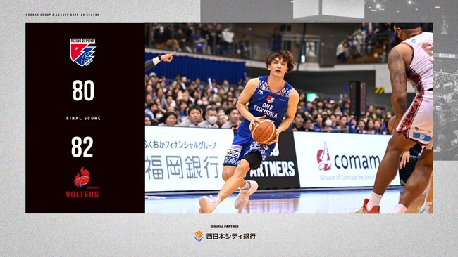 2026年4月1日(水)に開催した、りそなグループ B.LEAGUE 2025-26 シーズン【ライジングゼファーフクオカ vs.熊本ヴォルターズ】戦は、“福岡 80-82 熊本”で福岡の敗戦となりました。