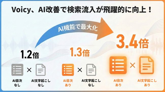 Voicyは、音声コンテンツの「AI目次表示」および「AI文字起こし」機能を2025年9月にリリースしました。本機能の導入と並行して実施したSEO改善の効果について、検索流入に変化が見られた上位1,000以上のチャンネルを対象に調査をおこなった結果、特定の条件下で放送ページへの検索流入数が最大3.4倍に増加したことをお知らせいたします。
