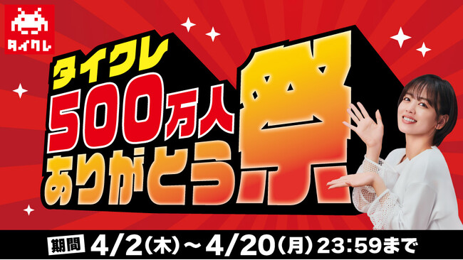 株式会社タイトー(本社:東京都新宿区、以下タイトー)が運営する、おうちでクレーンゲームが楽しめる「タイトーオンラインクレーン(以下タイクレ)」の登録者数が500万人を突破したことをお知らせいたします。また、500万人突破を記念し「タイクレ500万人ありがとう祭」(以下ありがとう祭)を4月2日(木)より開始します。「ありがとう祭」では、これまで支えてくださったお客様への感謝の気持ちを込めて、総額500万円相当のTC(タイトーコイン)※プレゼントキャンペーンや景品獲得の大チャンスとなる期間限定台の展開など、タイクレをお楽しみいただいているお客様は見逃せない特別イベントを開催いたします。ぜひこのお得な機会をお見逃しなく!