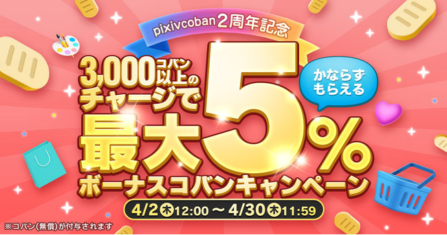 ピクシブ株式会社(本社:東京都渋谷区、代表取締役CEO:丹羽 康弘、以下ピクシブ)が運営する、「BOOTH」「pixivFANBOX」「pixivFACTORY」でのお支払いに利用できるプリペイド式電子マネー「pixivcoban」は、2026年4月2日(木)にサービスリリースから2周年を迎えます。これを記念して、同日より「pixivcoban2周年記念!最大5%必ずもらえる!ボーナスコバンキャンペーン」を実施します。