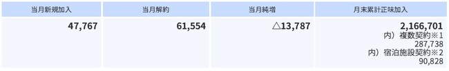 ※2:宿泊施設の客室で視聴するための宿泊施設事業者との契約については、視聴料金を個別に定めており、当該宿泊施設における契約客室の累計正味加入件(室)数は、月末累計正味加入件数に含めております。