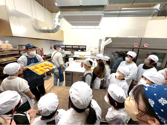 これまでに子ども達は、徳島県鳴門市の名産品・食文化や食品ロスについて考え、生産者、地元企業さんの前でプレゼンを行い、商品の値段について、販売する際のポイントなど、社会に出て必要となる多くの事を多方面で学んだ上で、今回2種類の梨パンを試作、製造へと実現させることが出来ました。