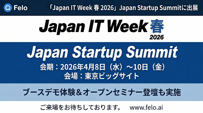 AI検索・生成AIプラットフォーム「Felo(フェロー)」を提供するFelo株式会社(本社:東京都千代田区)は、2026年4月8日(水)~10日(金)に東京ビッグサイトで開催される日本最大のIT・DX・AI総合展「Japan IT Week 春 2026」内の特別企画「Japan Startup Summit」(ブース番号:東3ホール S36)に出展いたします。