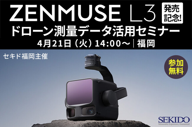 DJI(ディージェイアイ)正規販売代理店としてドローンの導入・運用支援を行う株式会社セキド(本社:東京都港区、代表取締役:大下貴之)は、セキド福岡(運営:株式会社レイメイセキド)主催にて、2026年4月21日(火)に福岡県福岡市で無料セミナー「『DJI ZENMUSE L3』発売記念!ドローン測量データ活用セミナー in 福岡」を開催します。