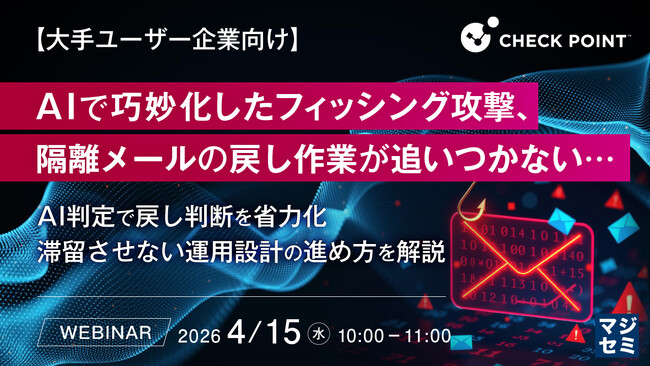 マジセミ株式会社は「【大手ユーザー企業向け】AIで巧妙化したフィッシング攻撃、隔離メールの戻し作業が追いつかない…」というテーマのウェビナーを開催します。