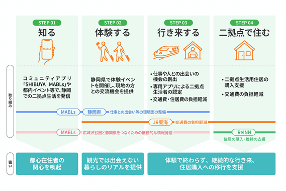 2025年度は東急不動産、静岡県、JR東海が連携し、東急不動産が提供する、渋谷の価値を育むコミュニティアプリ「SHIBUYA MABLs(渋谷マブルス)」ユーザーを対象に、静岡県での二拠点生活を体験するイベントを12月に開催し、参加者の交通費負担を軽減する等、二拠点生活の推進に向けた取り組みを始めました。