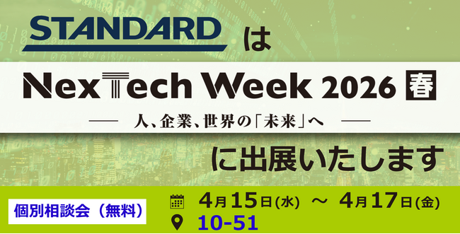 大手企業を中心に1,500社以上のデジタルトランスフォーメーション(以下「DX」)の推進と内製化を支援する株式会社STANDARD(本社:東京都港区、代表取締役社長:伊藤海、以下「当社」)は、2026年4月15日(水)から2026年4月17日(金)に開催される協賛イベント「NexTech Week 2026 春」(主催:RX Japan 合同会社)に出展いたします。