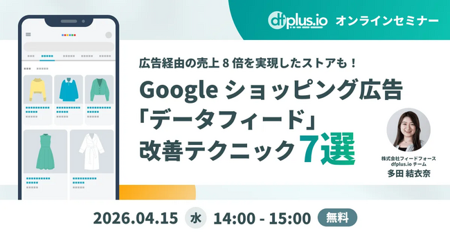 株式会社フィードフォース(所在地:東京都港区、代表取締役:塚田 耕司、以下「フィードフォース」)が提供する、マーケターのためのデータフィード管理ツール「dfplus io」は、無料オンラインセミナー「Google ショッピング広告の「データフィード」改善テクニック 7 選」を 2026 年 4 月 15 日(水)に開催いたします。