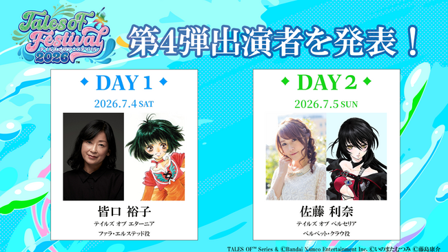 DAY1には、「テイルズ オブ エターニア」ファラ・エルステッド役 皆口 裕子さんが追加出演。DAY2には「テイルズ オブ ベルセリア」ベルベット・クラウ役 佐藤 利奈さんの追加出演が決定いたしました!こちらで「テイルズ オブ フェスティバル 2026」の出演者が出そろいました!ぜひ当日の公演をお楽しみいただけますと幸いです。