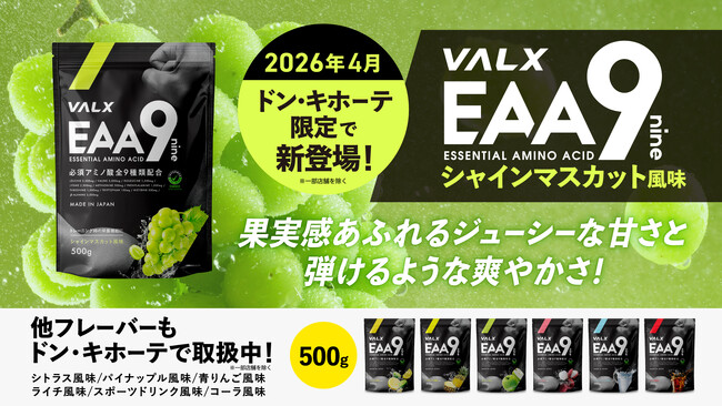 フィットネスブランド「VALX(バルクス)」を展開するVALX株式会社(本社:東京都渋谷区、代表取締役:只石昌幸、以下VALX)は、必須アミノ酸サプリメント「VALX EAA9」シリーズより、新フレーバー『VALX EAA9 シャインマスカット風味』を、2026年4月より全国のドン・キホーテ(一部店舗を除く)限定で、順次発売いたします。