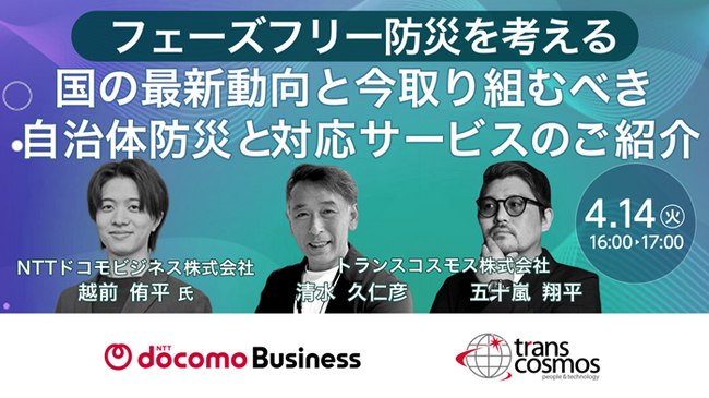 トランスコスモスは、オンラインセミナーフェーズフリー防災を考える「国の最新動向と今取り組むべき自治体防災と対応サービスのご紹介」を4月14日(火)に開催します。