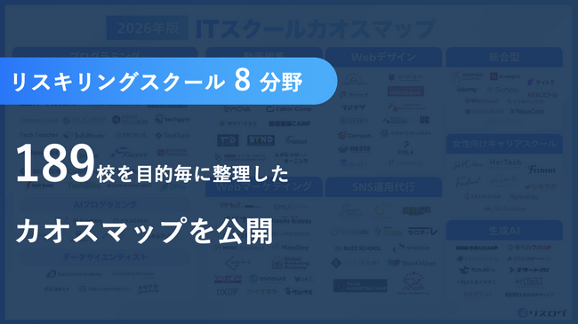 reslog株式会社(本社:埼玉県さいたま市、代表取締役:大野 克也、以下「リスログ」)は、リスキリング需要の高まりやIT人材不足が社会課題として注目される中、ITスクール(Webデザインやプログラミングなど)市場の全体像を可視化した、「ITスクールカオスマップ2026年版」(以下「本マップ」)を作成しました。本マップでは、リスキリングを検討する社会人・求職者を主な対象に、189校を8つの分野を目的ごとに整理し、スクール選びにおける比較・検討を支援することを目的としています。