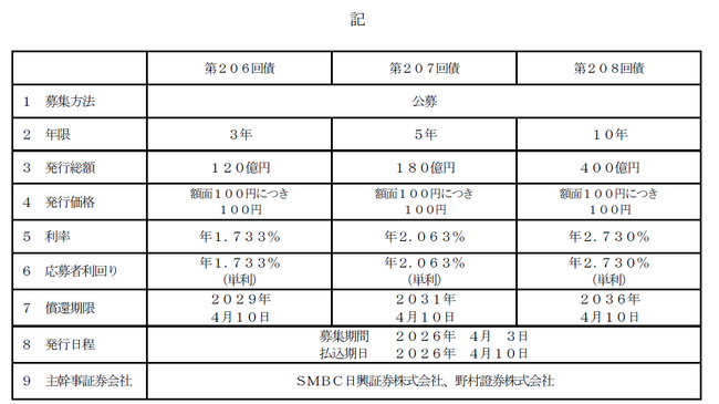 ・発行総額は3年債が120億円、5年債が180億円、10年債が400億円、合計700億円です。