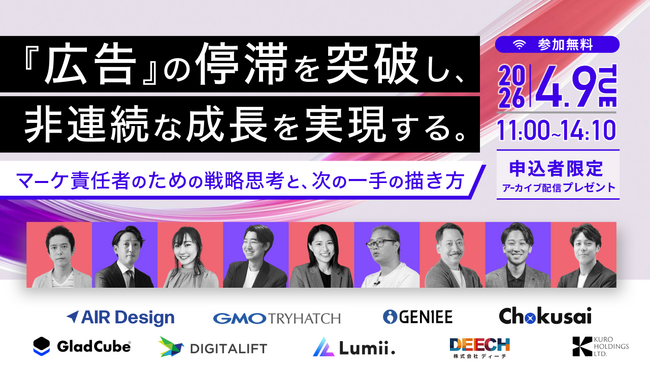 【2026年4月9日(木)開催】広告の停滞を突破し、非連続な成長を実現するための戦略思考と具体施策を、実践企業9社の知見から学べるマーケ責任者向けオンラインカンファレンス。