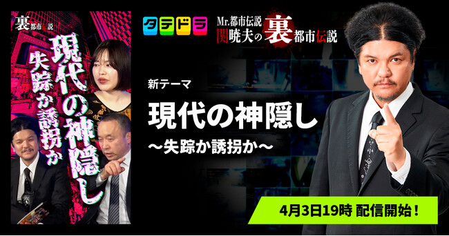 - 『Mr.都市伝説 関暁夫の裏都市伝説』、新作「現代の神隠し~失踪か誘拐か~」全15話を4月3日(金)より「タテドラ」で配信開始04/04 09:45