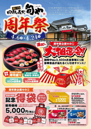 株式会社ケイフードサービス(本社:岡山県浅口市鴨方町、代表取締役社長:惠谷 龍二)は岡山県岡山市北区高柳西町の「瀬戸内回転寿司 旬や」にて、2026年4月6日(月)から4月24日(金)までの期間、オープン1周年を記念した「周年祭」を期間限定開催いたします。