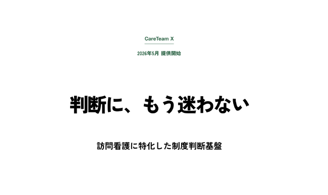 株式会社雲紙舎(東京都台東区、代表取締役:長屋好則)は、訪問看護に特化した制度判断基盤「ケアチームX」を発表しました。2026年5月より、訪問看護特化のレセプト代行サービス「ケアチーム」の既存顧客向けに、段階的な提供を開始する予定です。