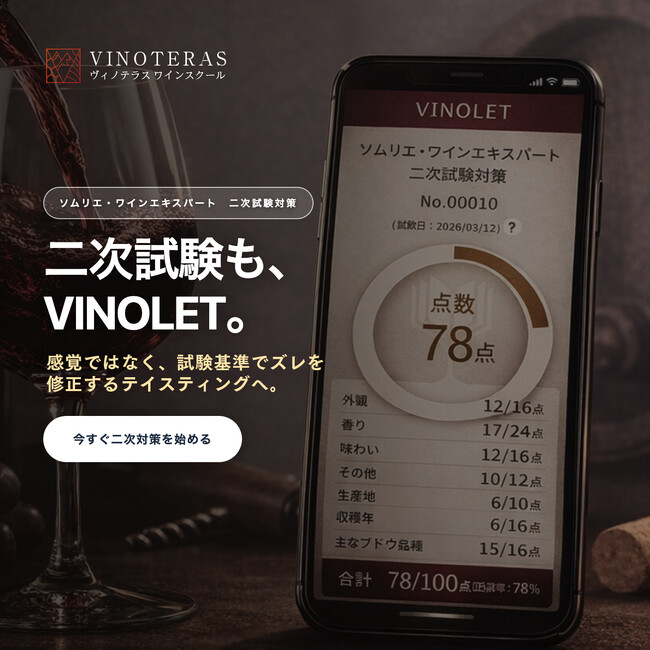 これまで一次試験対策としてご活用いただいていたWEB問題集アプリ「VINOLET」(ヴィノレット)に、新たに【テイスティング機能(二次試験対策)】が加わりました!
