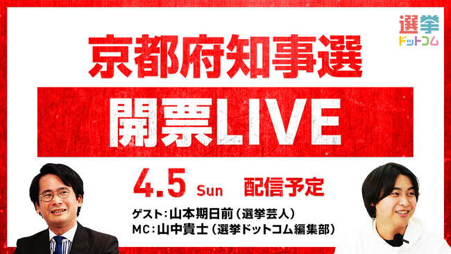 選挙ドットコムは「京都府知事選開票LIVE」を4月5日(日)20時から公式チャンネルで生配信!