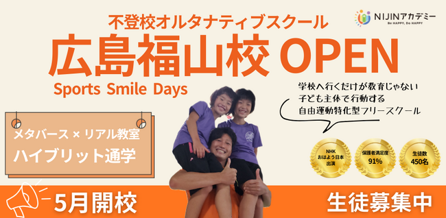 不登校の小中学生は年々増加し、2025年には過去最多となる35万3970人に達しました。子どもが安心して学び、多様な学び方を選択できる環境づくりは、社会全体で取り組むべき重要な課題となっています。こうした社会課題に向き合う株式会社NIJIN(本社:東京都江東区、代表取締役:星野達郎)は、不登校オルタナティブスクール『NIJINアカデミー』のリアル教室“広島福山校”を2026年5月13日に開校することをお知らせいたします。