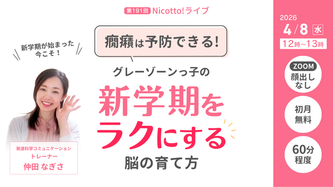 (株)パステルコミュニケーション(本社:東京都豊島区、代表取締役:吉野加容子)が運営する、発達障害・グレーゾーンの子どもを育てるママがいつでも学べて相談できるオンライン子育て塾「Nicotto!塾」は、2026年4月8日(水)お昼12時より、「癇癪は予防できる!グレーンゾーンっ子の新学期をラクにする脳の育て方」をテーマにオンラインライブを開催いたします。