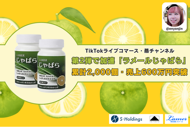ライブコマース事業、ブランド事業、AI事業などを展開し、日常と未来を彩る最高の体験を創造する株式会社Sホールディングス(本社:東京都品川区、代表取締役CEO: 燕 咏靖)は、当社運営のアパレルブランドABITOKYOが企画・配信するTikTokライブコマース「燕チャンネル」において、株式会社ラメール(本社:東京都港区、代表取締役:飯田広信)のサプリメント、「ラメールじゃばら」の第2弾販売を実施いたしました。2026年3月16日(月) の配信では、約10分の配信で用意した1,000個を完売し、シリーズ累計販売数は2,000個、累計売上は600万円を突破しました。2月24日(火)の販売に続き、高水準の販売実績を記録しています。