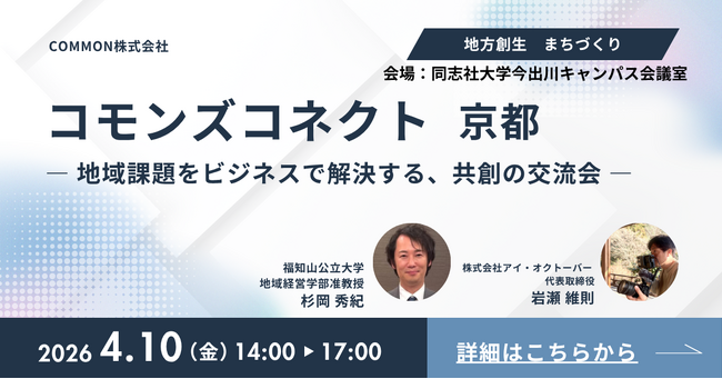 COMMON株式会社(本社:京都市、代表取締役:増田勇樹)は、2026年4月10日(金)、同志社大学今出川キャンパスにて、地域課題をテーマにした共創交流会「コモンズコネクト」を京都で初開催いたします。