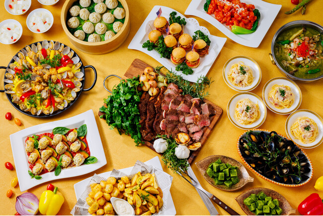 ほど良い赤身肉で食べ応えがありながらも、脂のしつこさがないオーストラリア産のサーロインステーキは、シェフが鉄板で焼き上げます。また、世界各国のグルメとして、赤ワイン仕立ての自家製デミグラスソースでお召し上がりいただく「ジャンボオムレツの牛肉の赤ワイン煮込みソース」やチキンとアサリの旨味が溶け込んだ「チキンとアサリのパエリア」、柔らかくなるまでじっくりと煮込んだ豚肉をほぐし、バーベキューソースで和えた一口サイズの「プルドポークのミニバーガー」などをご用意。さらに、杏仁豆腐や苺のムースなど25種類以上のメニューが揃います。お子様からご年配のお客様まで幅広い世代でお楽しみいただけます。